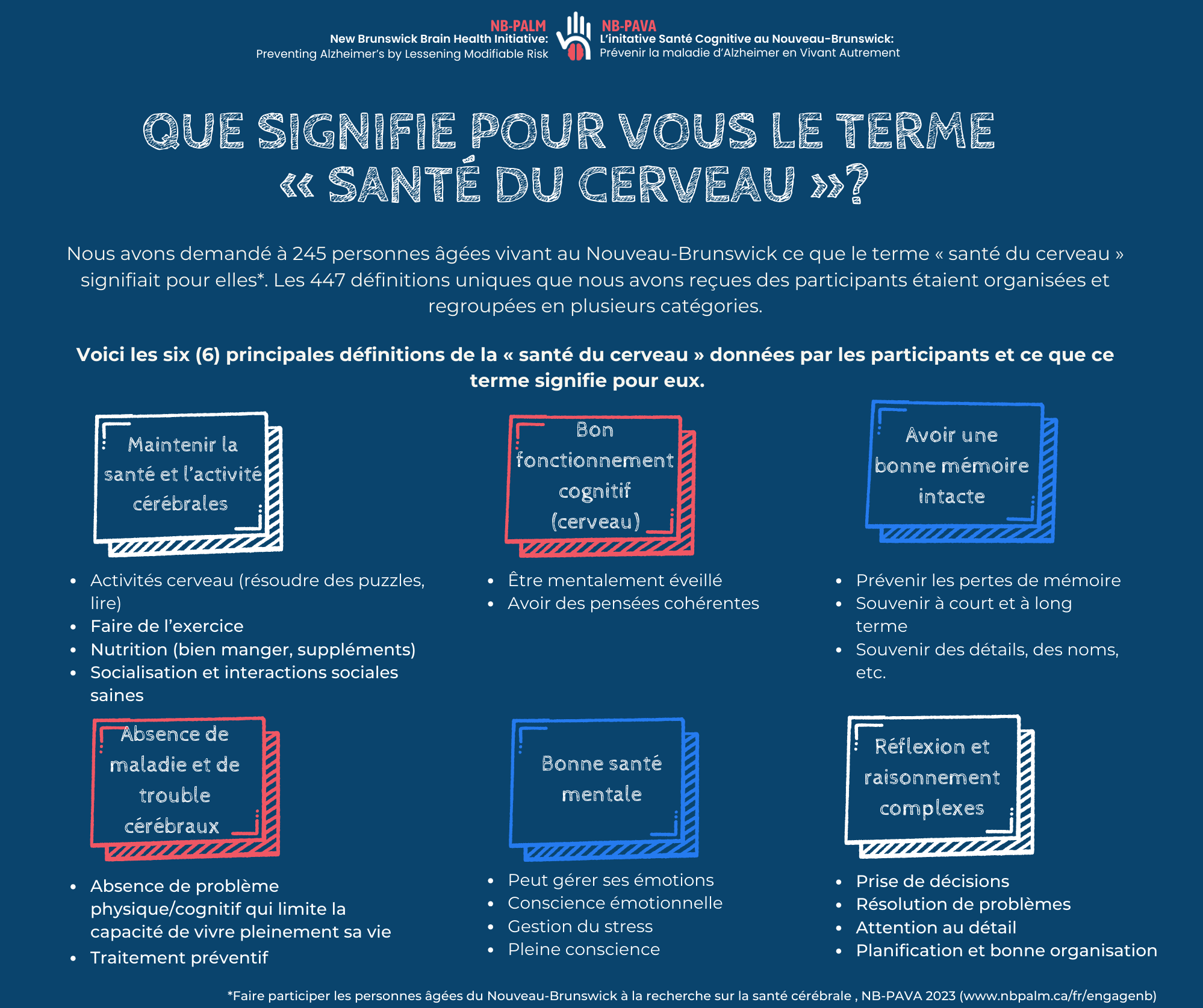 Les chercheur.e.s de NB-PAVA ont collaboré avec des partenaires communautaires pour élaborer un court sondage visant à recueillir les réflexions des participant·e·s sur la santé cérébrale, le maintien de leur santé au fil du temps et les meilleurs moyens d’en savoir plus sur les programmes qui favorisent la santé et le bien-être et d’y participer. Les participant·e·s ont pu répondre au sondage en anglais ou en français, en ligne, par la poste ou par téléphone.